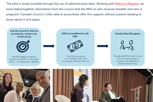 Using a data-led approach developed with Policy in Practice, Camden linked NHS and local authority data to identify low income households and proactively offer £500 grants to new mums. The report highlights how this enabled support to reach those most in need, with early findings showing reduced stress for families during pregnancy.