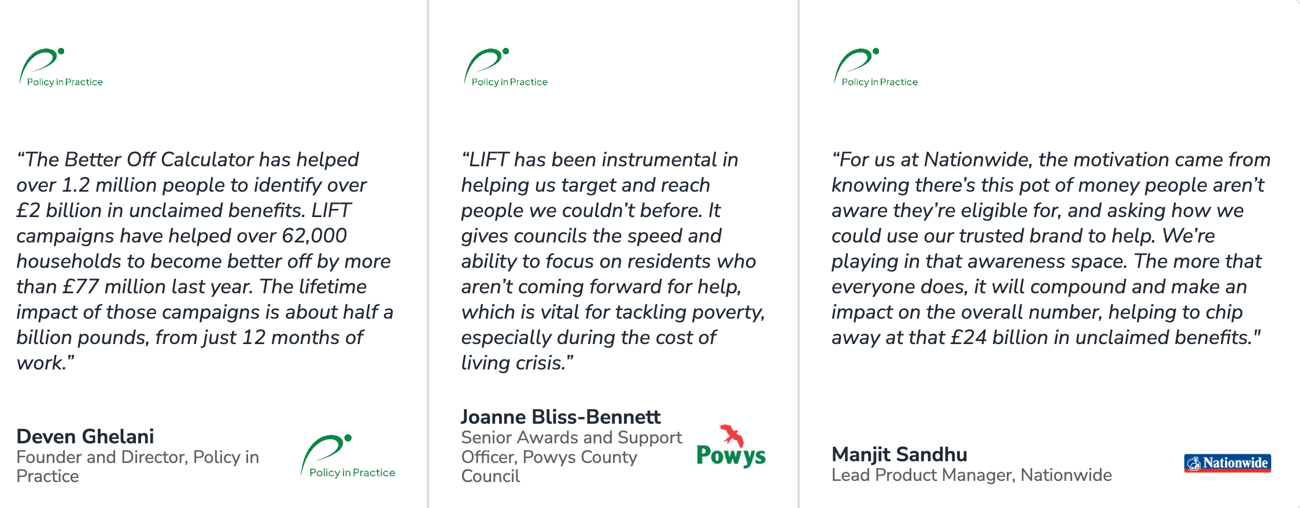 real impactThe Missing Out 2025 report shows the scale of the challenge is growing: over £24 billion in benefits and support is still going unclaimed, up from last year. More households than ever are missing out but at the same time, we’re proving that targeted action can close the gap. Last year alone, Policy in Practice helped 1.2 million people identify over £2 billion in unclaimed benefits, and supported them to successfully boost their income by more than £500 million. On average, households missing out could be £286 a month better off, and for those eligible for Universal Credit, the gain can be as high as £6,000 a year. Local authorities using our LIFT platform have already helped over 62,000 households become better off by £77 million each year, while our partners in the housing, utilities, finance and charity sectors, as well as local government, have helped over 230,000 people identify £1.4 billion in unclaimed support annually using the Better Off Calculator. Together, these tools are helping people unlock the money they’re due. Our partnerships are also making a difference. As Kathryn Townsend, Head of Customer Vulnerability & Accessibility at Nationwide, said:
