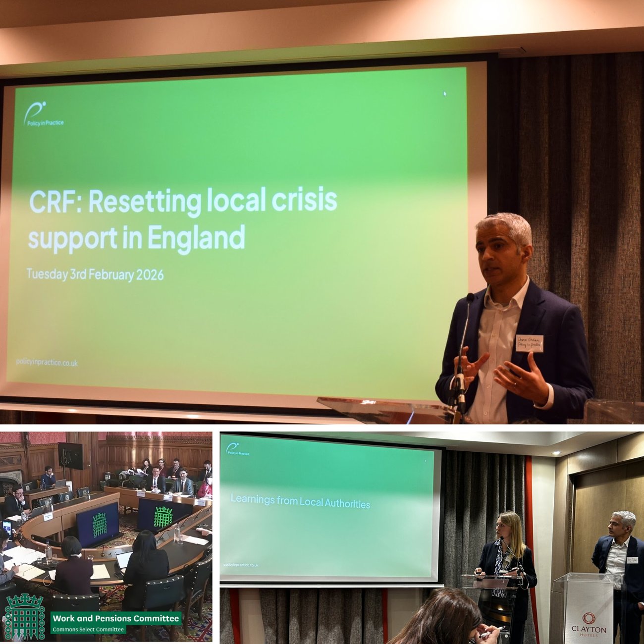 Clockwise: Deven Ghelani and Rowanne Willett, Policy in Practice, talked about delivering CRF at events in Manchester and London hosted by Huggg and the Post Office. Fabian Chessell, Policy in Practice, gave evidence to the Work and Pensions Select Committee's Transition to State Pension Age inquiry