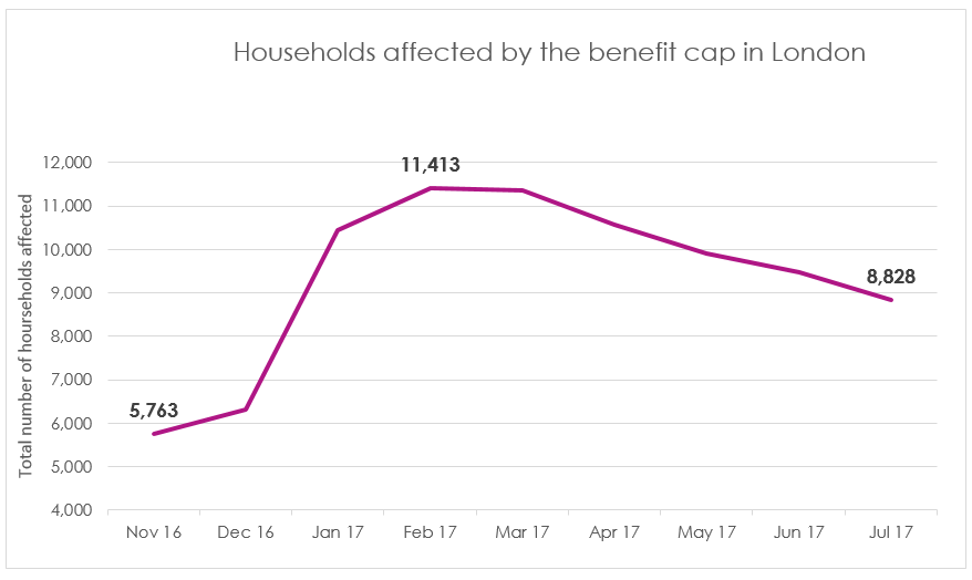 Just over 11,400 families from 19 London Boroughs were affected by the benefit cap when it was fully rolled out in February 2017. This fell by 23% over the first six months, to just under 9,000: