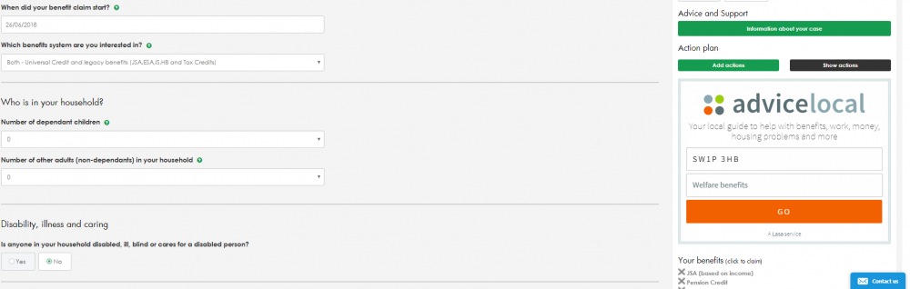 From Monday 2 July we're integrating Advicelocal, a new tool from Lasa, into your Benefit and Budgeting Calculator. Using the built in postcode based tool advisors will be able to give customers local advice and support relating to seven areas of law - welfare benefits and tax credits; council tax; debt and money advice; housing and homelessness; employment and work issues; disability and social care; and asylum and immigration.